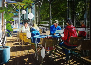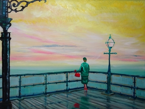 2024Wolken, een trap en een surrealistieche levensboom met een dame dit dit beschouwt